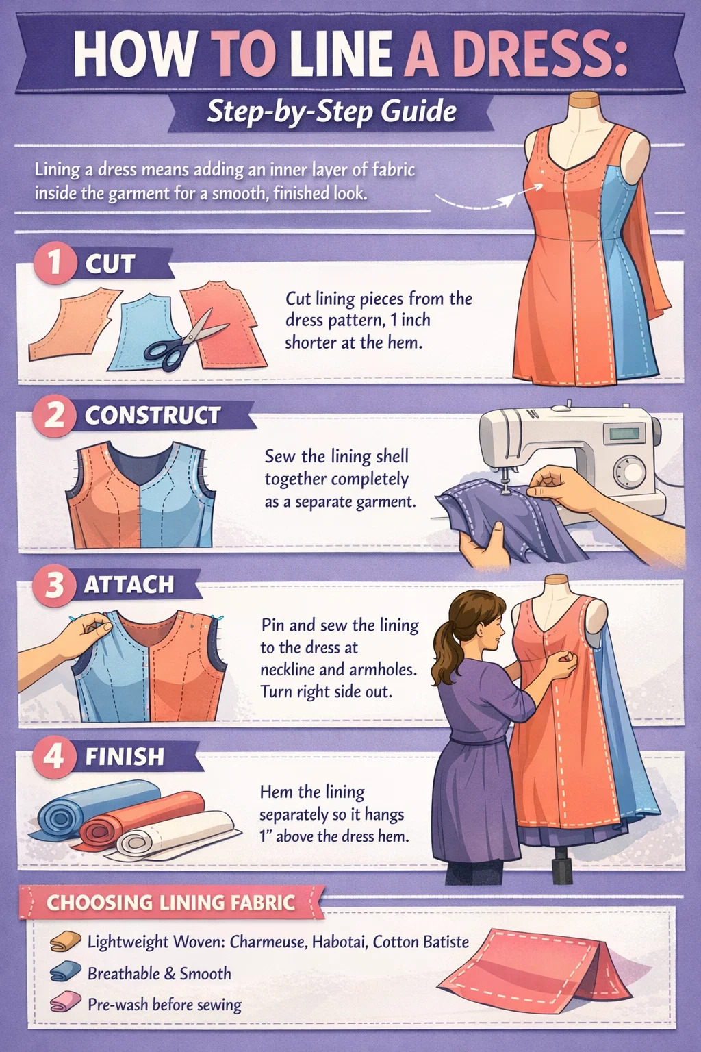 Väčšina domácich šijačov dokončí základnú podšívku šiat v štyroch fázach: vyrežte, postavte, pripevnite a dokončite . Či už pracujete so štruktúrovaným živôtikom alebo pružnou sukňou, základná logika je rovnaká. Čo sa mení je, ktoré švy spojíte ako prvé a ako s lemom narábate.