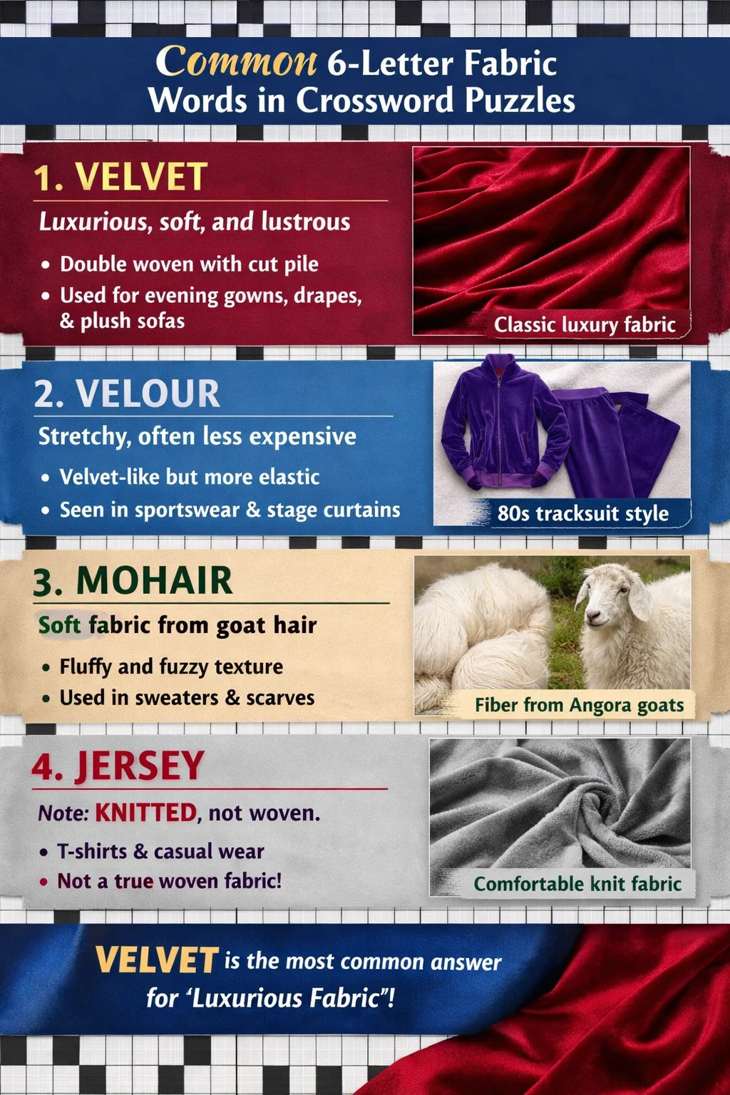 V krížovkách, ak vodítko opisuje „luxusné, mäkké a zamatové“ 6-písmenové tkaná látka , najklasickejšia odpoveď je ZAMAT.