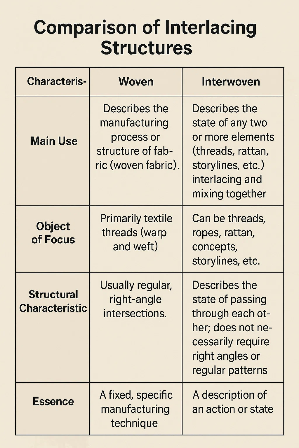 | Primárne použitie | Popisuje špecifický výrobný proces alebo hotovú štruktúru textílií (tkanín). | Opisuje stav, v ktorom sú ľubovoľné dve alebo viac sád prvkov (vlákna, trstiny, dejové línie atď.) prekrížené alebo zmiešané. |