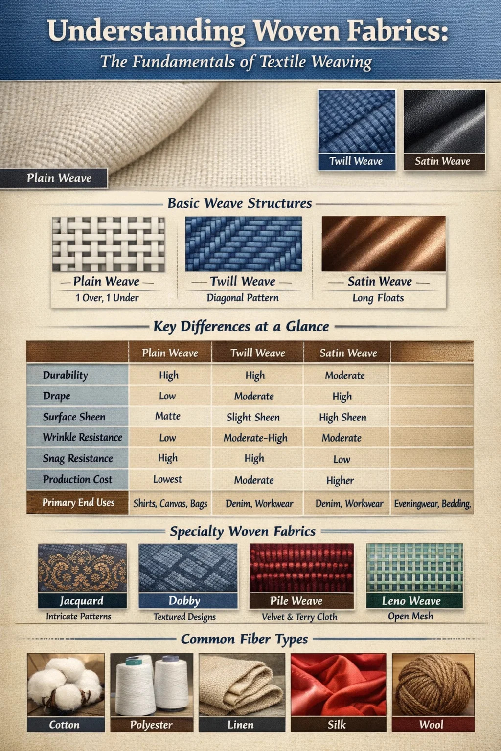 Existujú tri základné typy väzieb, ktoré tvoria základ takmer všetkých tkaných textílií: plátnová väzba, keprová väzba a atlasová väzba. Každá iná tkaná štruktúra – od plátna cez zamat až po žakár – je odvodená alebo postavená na týchto troch základných kategóriách.