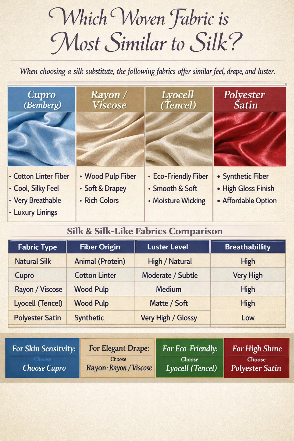 Pri hľadaní a tkaná látka ktoré replikujú luxusný pocit, lesk a splývavosť prírodného hodvábu, sú najvýznamnejšími uchádzačmi Rayon, Cupro a Lyocell (Tencel) . Medzi týmito Cupro je všeobecne považovaný za najbližší zápas z hľadiska priedušnosti a hodvábneho dotyku, pričom Polyester so saténovou väzbou slúži ako najbežnejšia cenovo dostupná syntetická alternatíva. Tieto tkaniny využívajú špecifické tkanie techniky napodobňujúce hladké proteínové vlákna produkované priadkou morušovou.